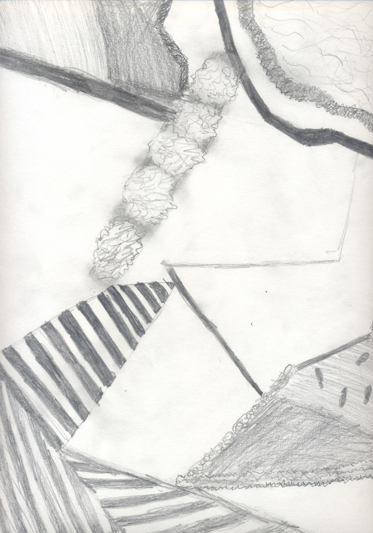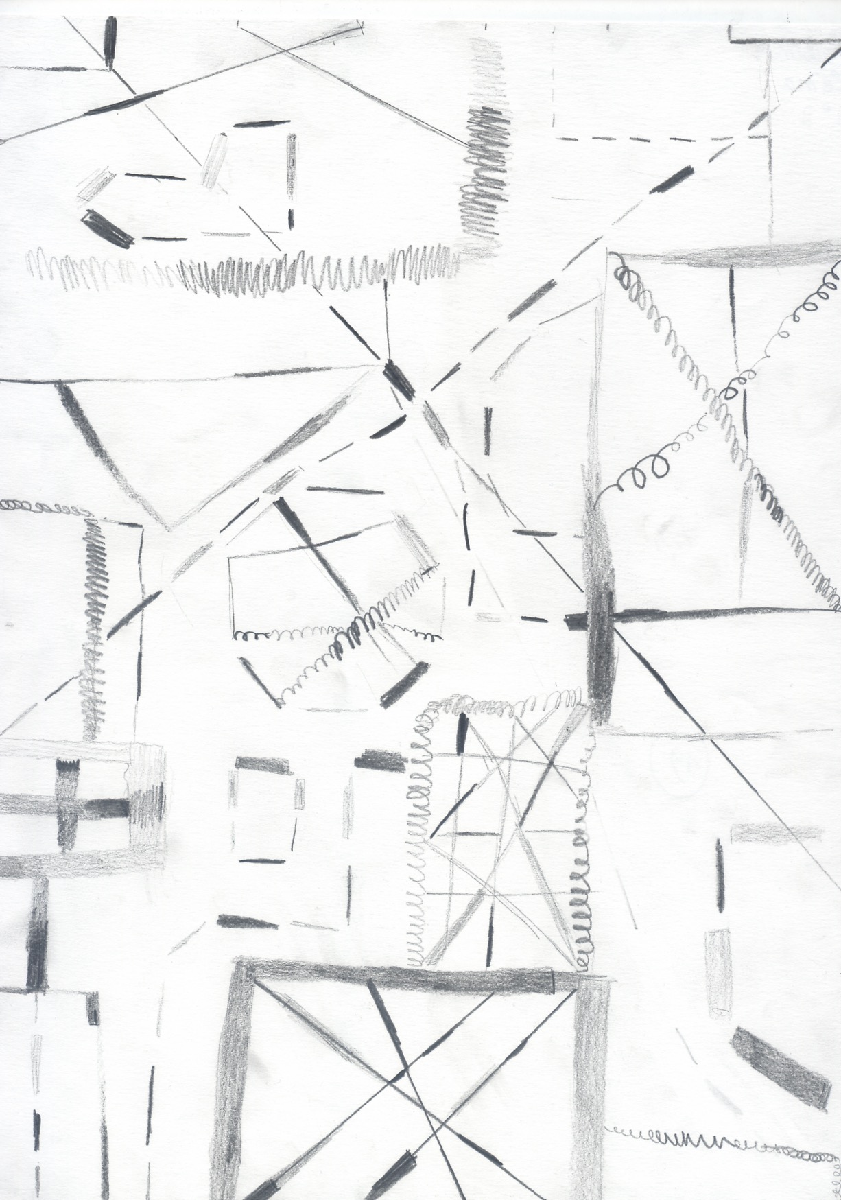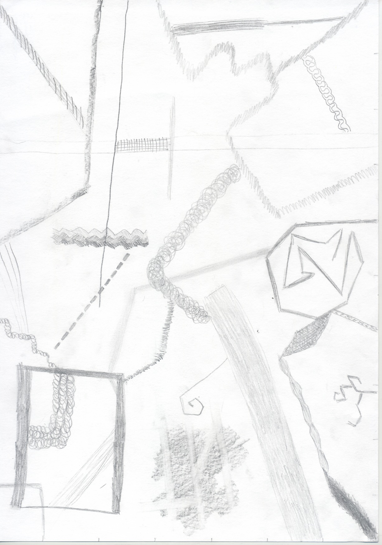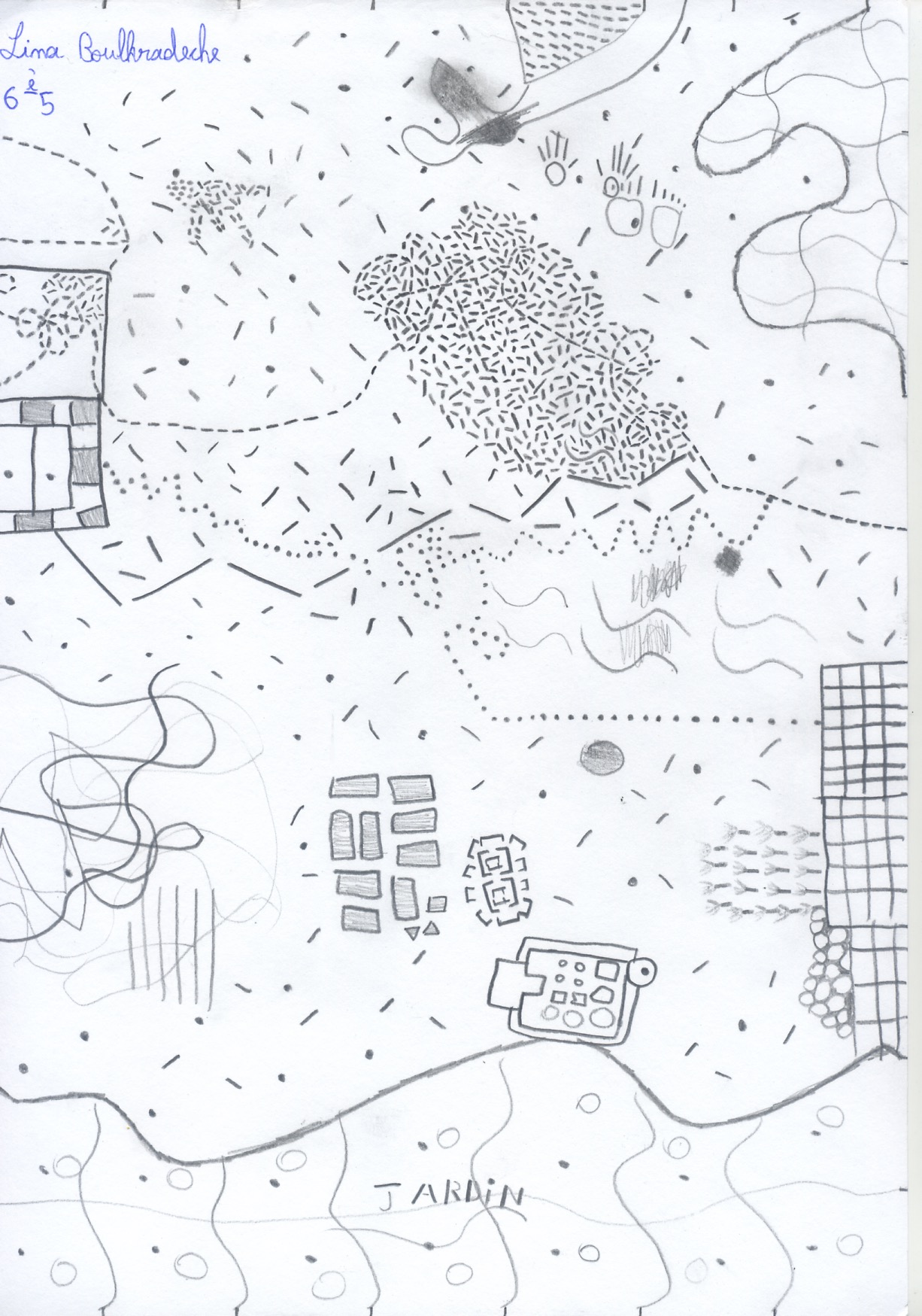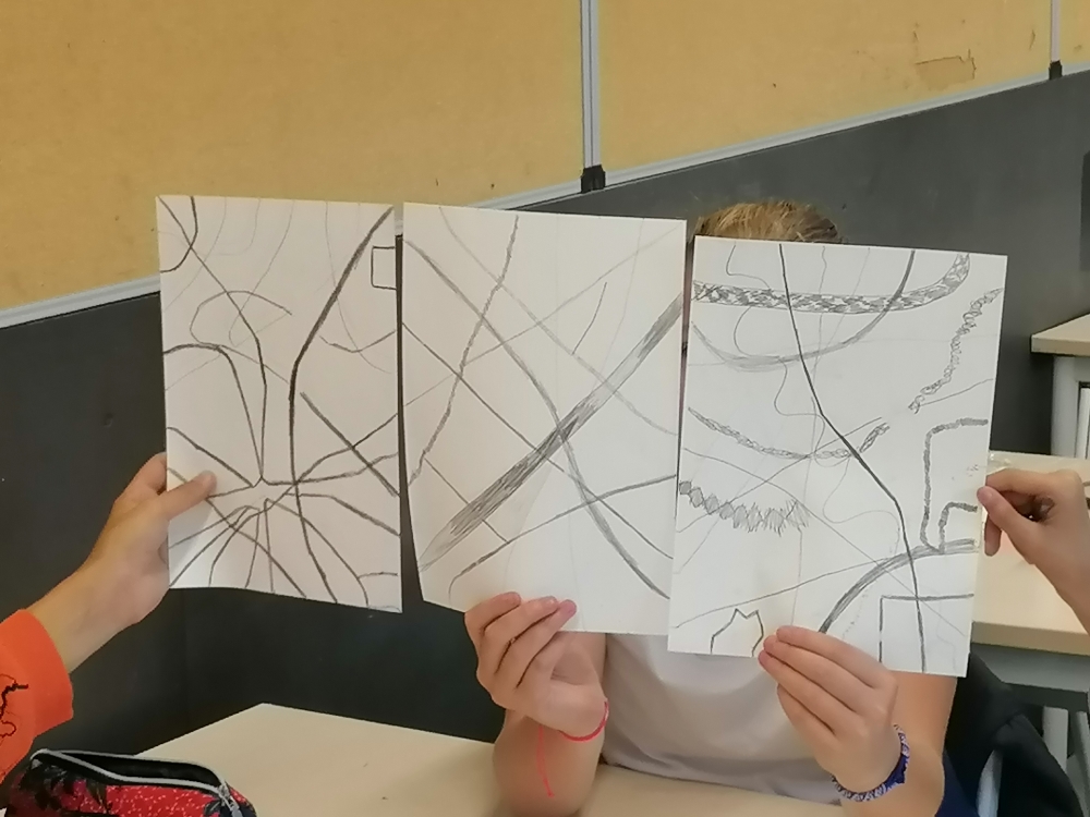Après avoir ponctué le pourtour de leur feuille à dessin de petits repères permettant de joindre éventuellement les différents dessins entre eux pour réaliser une continuité paysagère, les élèves ont eu à créer avec leur crayon à papier des lignes de toutes sortes, épaisses, fines, sombres ou claires, avec des matières, lisses, hachurées, faites de textures, de contrastes ou très construites par les effets géométriques, ou au contraire anarchiques en apparence, parallèles ou non, etc...